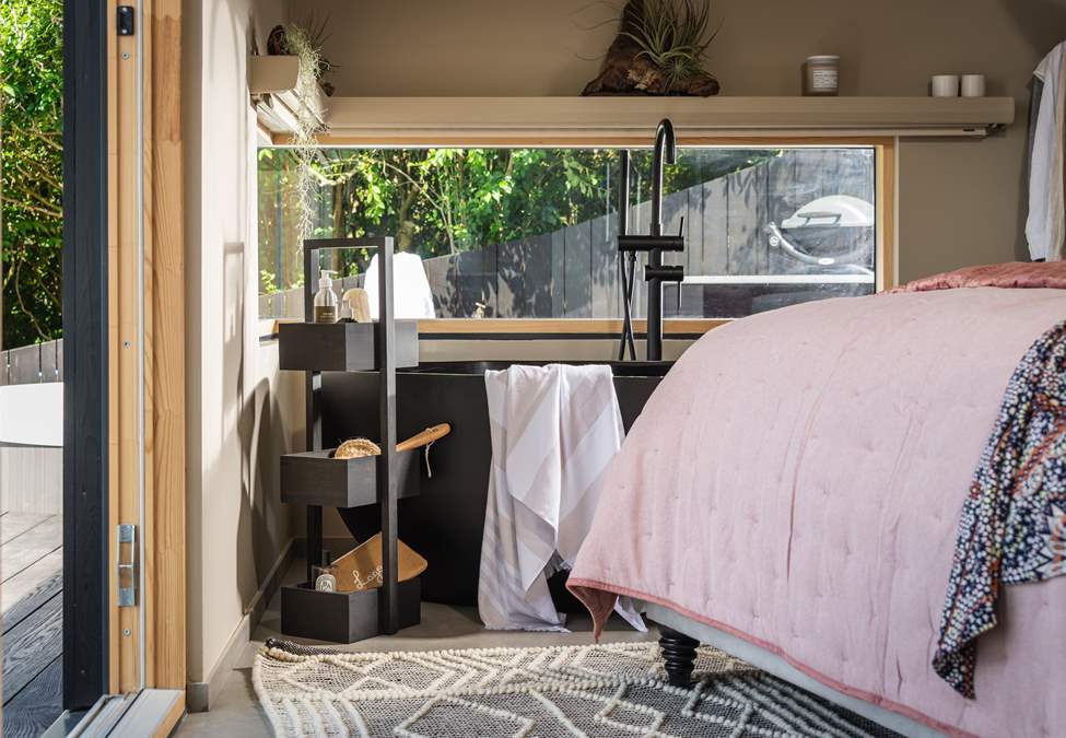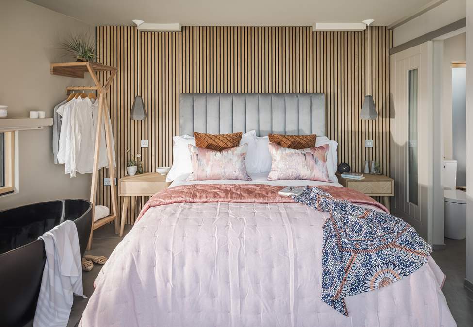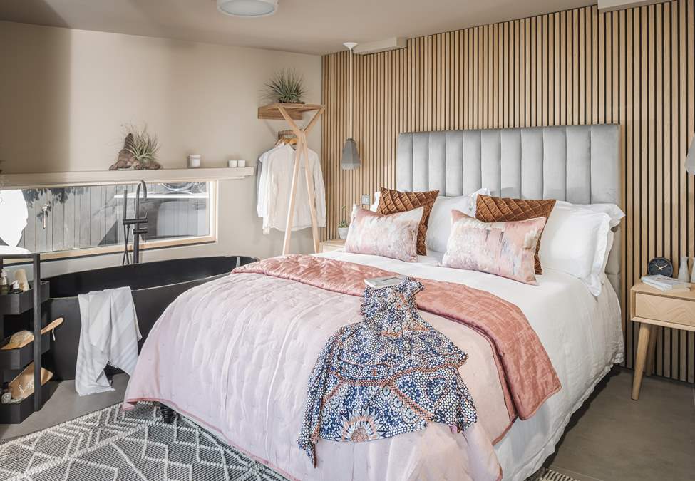 The bedroom space is home to a king size bed whilst the charcoal-black bath is just perfect for soothing soaks. In addition, there's a rainfall shower and underfloor heating to keep toes toasty underfoot.