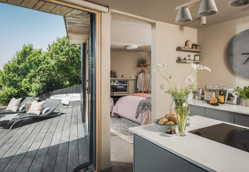 Within the kitchen area you'll find an island complete with induction hob and cooker, along with everything you could possibly need to rustle up a feast. Settle into the super-comfy backed stools with a glass of wine, whilst gazing over the ever-changing tides. Sliding doors lead out onto the deck.