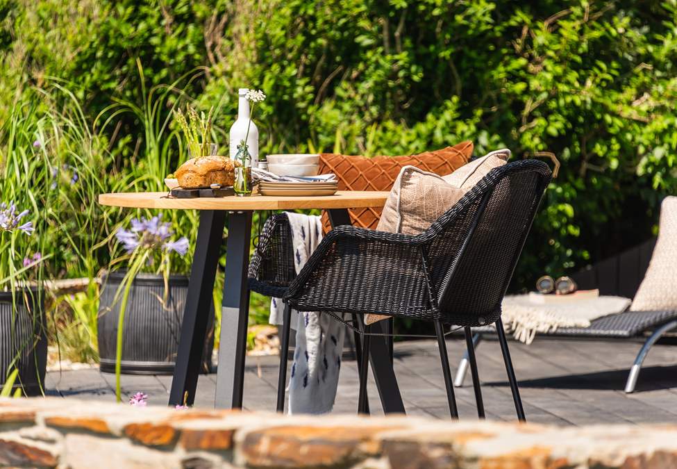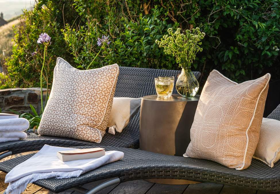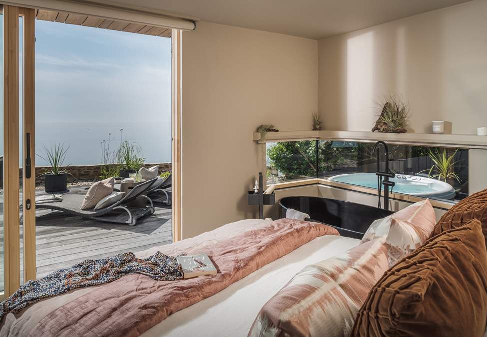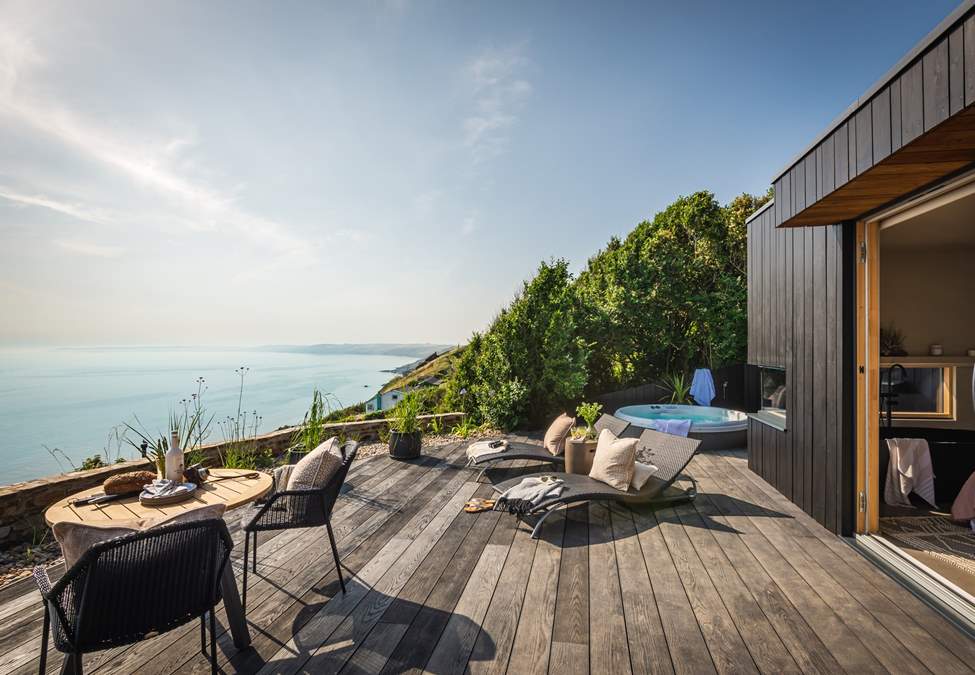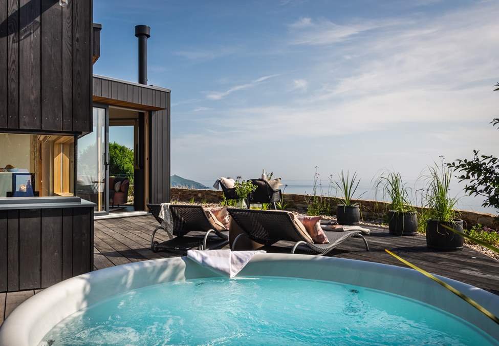 Outside you'll find a sun-soaked deck, offering a bubbling hot tub with far-reaching views of the horizon. In addition, there are sun loungers, outdoor chairs, a bistro table for alfresco dining and an electric Weber barbeque.