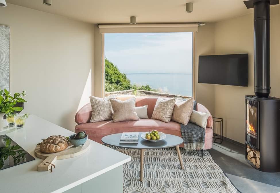 Fika's main living space is open plan, with views through the double aspect, full height picture window. A curved, blush velvet sofa, beside the gorgeous wood burning stove, is made for cosy evenings in front of the fire and a dose of storm-watching as the waves roll in. There's a Smart TV for catching up on your favourite series and a Bluetooth speaker to create the perfect soundtrack for your getaway.