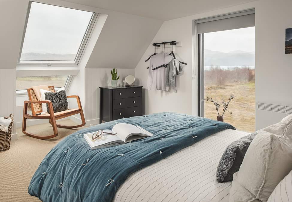 Aulinn's exterior perfectly reflects the untamed beauty of the island landscape, however take your first steps inside to discover the combination neutral hues and rustic interior style with a modern twist create a simply chic sanctuary. Open plan living on the ground floor promises panoramic views over misty moorland, ocean tides and rolling mountains revealing an awe-inspiring backdrop to your everyday. The effortless beauty of this living space holds a cosy wood burning stove for perfect evenings gazing over the ever-changing horizon, whilst a fully equipped kitchen offers to option to simply never leave this captivating cabin.
